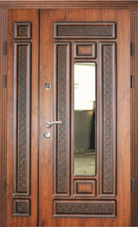 Поскольку в большинстве случаев устанавливаемые на входе в коттедж двустворчатые двери являются еще и предметом интерьера, украшающим здание, их дизайну предается особое значение. Эти двери, как правило, отделываются атмосферостойким МДФ, натуральным шпоном, массивом. Эффектно на таких дверях смотрится витражный узор, применение ковки, зеркальных элементов. Вариантов декора входной двустворчатой двери масса, тут все зависит от пожеланий заказчика.